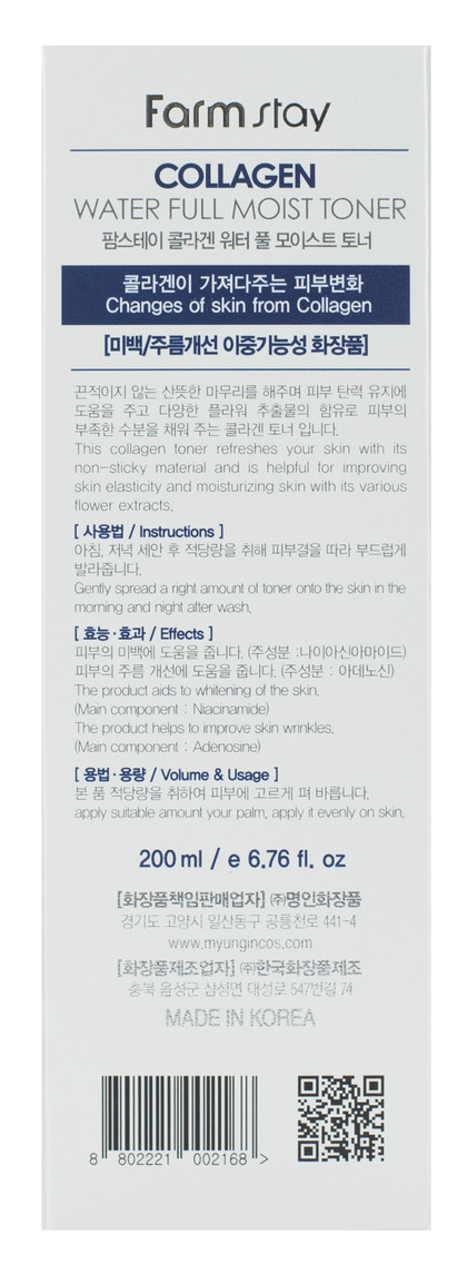 Изготовитель: MYUNGIN COSMETICS CO. LTD., 441-4, Gongneungcheon-ro, Ilsandong-gu, Goyang-si, Gyeonggi-do, РЕСП. КОРЕЯ. Тонер увлажняющий при помощи гидролизованного коллагена и комплекса 5 растительных экстрактов (цветов белого персика, магнолии, камелии, фрезии и сливы) позволяет глубоко и надолго увлажнить кожу и поддерживать ее в отличном состоянии. Подготавливает кожу к нанесению средств ухода, регулирует ph-баланс.