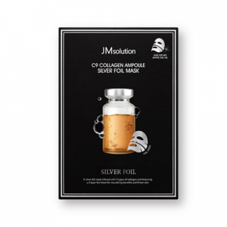 Ампульная маска с серебром и коллагеном JMsolution C9 Collagen Ampoule Silver Foil Mask улучшает эластичность кожи, повышает её плотность и заметно уменьшает выраженность мелких морщин, возвращая лицу отдохнувший вид. Средство осветляет пигментацию, сужает поры и укрепляет защитный барьер, а также борется с тусклостью и стимулирует естественное сияние кожи.